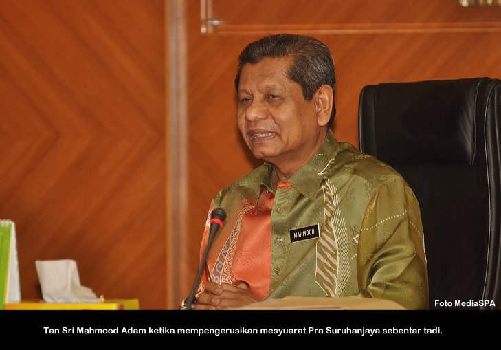 PUTRAJAYA, 24 Julai ------ Tan Sri Mahmood Adam pagi ini telah mempengerusikan Mesyuarat Pra Suruhanjaya. Mesyuarat yang bermula sebentar tadi turut dihadiri Setiausaha S.P.A Datuk Ramli Juhari, Timbalan Setiausaha (Pengambilan) Zainal Abidin Ahmad, Timbalan Setiausaha (Perkhidmatan) Lim Mooi Eia serta pegawai-pegawai kanan S.P.A. ------  MediaSPA