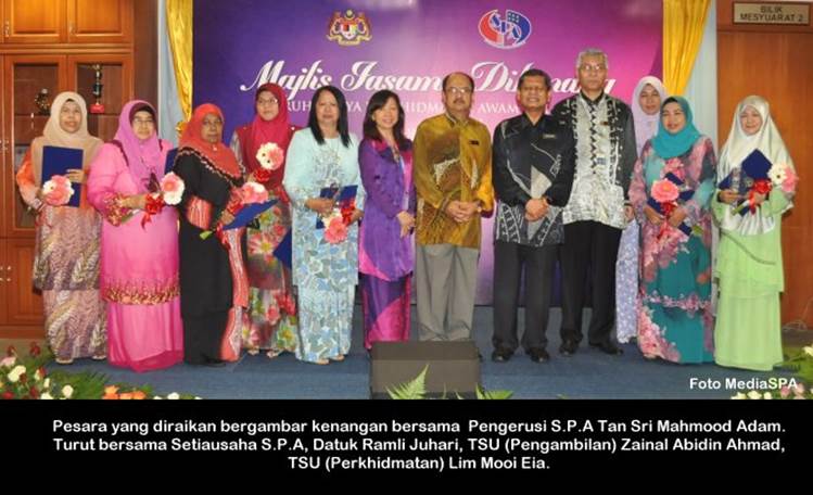 PUTRAJAYA 8 Mei------ Suruhanjaya Perkhidmatan Awam Malaysia (S.P.A) akan terus mencari calon yang berkualiti untuk dilantik sebagai penjawat awam. Pengerusi S.P.A, Tan Sri Mahmood Adam berkata demikian dalam ucapan di Majlis Jasamu Dikenang S.P.A Tahun 2014 yang diadakan hari ini. Katanya lagi, calon yang di cari itu mestilah menpunyai CTI iaitu Cepat Tepat Integriti, PCI iaitu Produktif Kreatif Inovatif dan LOF Setia Terbuka Memudahkan. Seramai 13 orang mantan warga S.P.A yang bersara pada tahun 2013 dan 2014 di rai dimajlis makan tengah hari yang diadakan di Dewan Temu duga S.P.A Putrajaya. ------MediaSPA