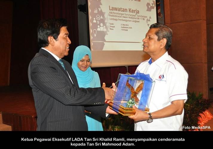 LANGKAWI, 21 Mei ------ Peserta Persidangan Suruhanjaya-Suruhanjaya Perkhidmatan Awam Malaysia Ke-17 hari ini telah membuat lawatan kerja ke Lembaga Pembangunan Langkawi (LADA). Delegasi seramai 150 peserta diketuai oleh Pengerusi S.P.A, Tan Sri Mahmood Adam. Turut bersama dalam lawatan, Ahli-Ahli Suruhanjaya dan Pengerusi-Pengerusi SPA negeri-negeri. Terdahulu dari itu rombongan telah dibawa melawat ke Gelaria Perdana yang menempatkan barang-barang cenderamata dari pemimpin dunia yang diterima semasa Tun Dr. Mahathir Mohamad menjadi Perdana Menteri. ------MediaSPA