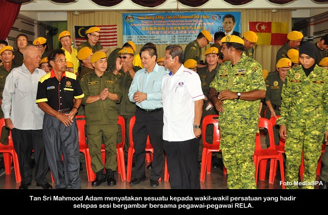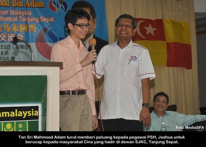 TANJUNG SEPAT, 25 Mei ------ Pengerusi S.P.A Tan Sri Mahmood Adam telah mengadakan sesi interaksi dan dialog bersama persatuan-persatuan dan masyarakat setempat di Tanjung Sepat, Selangor. Sesi interaksi yang diadakan di Sekolah Jenis Kebangsaan (Cina) petang semalam turut di hadiri Ahli Suruhanjaya dan pegawai-pegawai kanan S.P.A. Satu sesi taklimat kerjaya turut disampaikan oleh Timbalan Setiausaha (Perkhidmatan) Lim Mooi Eia. Terdahulu dari itu Tan Sri Mahmood Adam merasmikan penutup Kursus Pengenalan RELA bagi Daerah Kuala Langat. ------MediaSPA