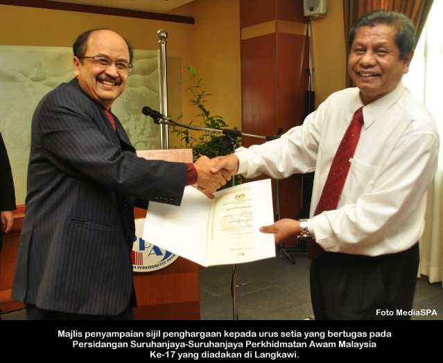 PUTRAJAYA 26 Mei ------ Pengerusi S.P.A Tan Sri Mahmood Adam hari ini mengucapkan terima kasih dan tahniah kepada warga S.P.A serta urus setia bertugas di Persidangan Suruhanjaya-Suruhanjaya Perkhidmatan Awam Malaysia Ke-17 yang diadakan di Langkawi pada minggu lepas berjalan dengan lancar. Beliau berkata demikian dalam satu majlis ringkas penyampaian sijil penghargaan yang diadakan tengah hari tadi. Menurutnya lagi beliau berasa bangga kepada semua pertugas termasuk dari urus setia Suruhanjaya Perkhidmatan Pelajaran (SPP), SPA Negeri dan kakitangan Pejabat Setiausaha Kerajaan Negeri Kedah serta Jabatan-Jabatan yang terlibat. ------ MediaSPA