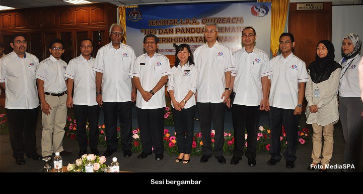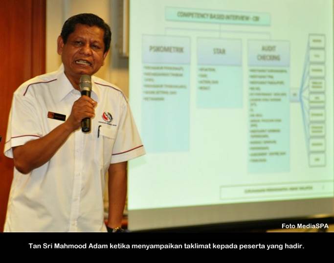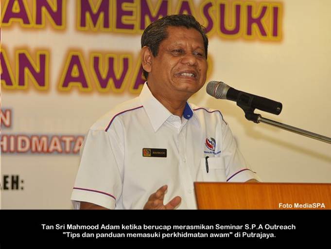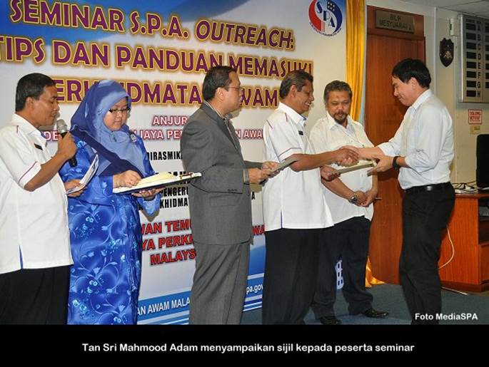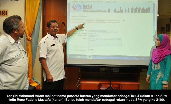 PUTRAJAYA, 4 Januari------ Pengerusi S.P.A, YBhg. Tan Sri Mahmood Adam hari ini telah melancarkan IM4U Rakan Muda S.P.A. IM4U Rakan Muda S.P.A ini adalah ilham daripada beliau yang bertujuan untuk merapatkan hubungan antara S.P.A dengan anak-anak muda supaya golongan ini tidak menganggap S.P.A hanyalah untuk orang-orang tertentu sahaja. Katanya lagi, mereka yang berumur 40 tahun ke bawah bolehlah mendaftar secara online di Portal S.P.A. Beliau berkata demikian di Majlis Perasmian Seminar S.P.A Outreach “Tips Dan Panduan Memasuki Perkhidmatan Awam” bertempat di Dewan Temu duga, Putrajaya hari ini. Turut hadir, Timbalan Pengerusi S.P.A, YBhg. Dato’ R. Segarajah dan pegawai-pegawai kanan S.P.A. Seminar SPA Outreach ini akan diadakan pada setiap hari Sabtu atau Ahad di seluruh Negara sepanjang tahun 2014 ini dan mereka yang berminat boleh melayari Portal S.P.A di www.spa.gov.my. Terdahulu dari itu, Tan Sri Mahmood Adam telah menyampaikan taklimat mengenai tips dan panduan memasuki perkhidmatan awam. Beliau juga turut menyampaikan sijil kepada para peserta. ------ MediaSPA