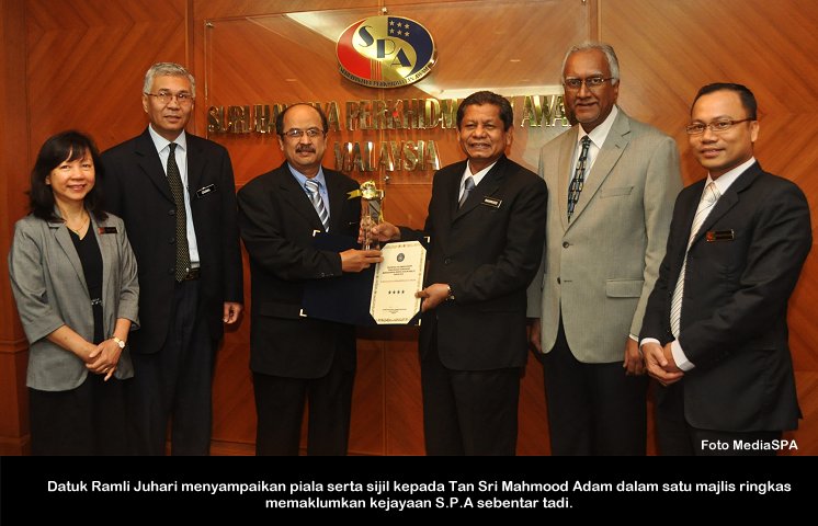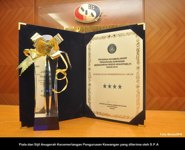 NILAI, 7 Januari------ Suruhanjaya Perkhidmatan Awam Malaysia telah menerima Anugerah Tahap Cemerlang (4 Bintang) “Pencapaian Tertinggi Dalam Pengurusan Kewangan” berdasarkan Indeks Akauntabiliti oleh Jabatan Audit Negara bagi tahun penilaian 2012. Sebanyak 22 agensi persekutuan termasuk Suruhanjaya Perkhidmatan Awam Malaysia telah menerima sijil serta piala yang telah disampaikan oleh Ketua Setiausaha Negara, YBhg. Tan Sri Dr. Ali Hamsa di satu majlis yang diadakan di Akademi Audit Negara semalam. Setiausaha S.P.A, YBhg. Datuk Ramli Juhari hadir dan menerima anugerah tersebut. Turut hadir Timbalan Setiausaha (Perkhidmatan), Puan Lim Mooi Eia dan Setiausaha Bahagian (Pengurusan) Encik Mohd Nazri Dollah. ------MediaSPA