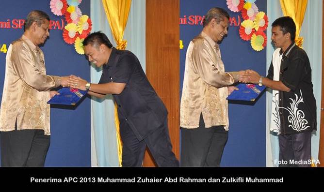 PUTRAJAYA, 30 Jan------ Pengerusi S.P.A, YBhg. Tan Sri Mahmood Adam hari ini telah menyampaikan insentif berupa cek bernilai RM3,000.00 setiap seorang kepada pemain badminton yang telah berjaya mengharumkan nama Suruhanjaya Perkhidmatan Awam dalam perlawanan Antarabangsa dan dalam Negara iaitu Sannatasah Saniru yang telah menjadi Naib Johan Perseorangan Wanita Badminton Bahrain International Series 2013 serta Johan Bergu Campuran Bangladesh International Challenge 2013 berpasangan dengan Muhammad Adib Haiqal Nurizwan. Turut menerima insentif Mohd Ariff Abdul Latiff yang menjuarai perlawanan perseorangan lelaki Maybank Kuching International Challenge 2013. Penyampaian hadiah telah dilakukan di majlis perhimpunan bulanan S.P.A anjuran Bahagian Pengurusan bersama ASPA di dewan temu duga Putrajaya. Pengerusi S.P.A juga turut menyampaikan sijil penghargaan kepada 26 orang petugas One Stop Centre dan penyampaian sijil kepada 6 orang penerima Anugerah Perkhidmatan Cemerlang (APC) 2013, peminjam buku terbanyak serta penyampaian kit kepada kakitangan yang baharu bertugas di S.P.A. Di perhimpunan ini juga, artis jemputan khas iaitu pelakon terkenal Aaron Aziz telah menyampaikan ceramah motivasi selama 45 minit tentang kehidupan dan kejayaan beliau. Terdahulu, Aaron Aziz telah membuat kunjungan hormat ke atas YBhg. Tan Sri Mahmood Adam. ------MediaSPA