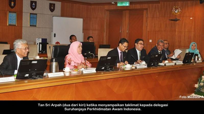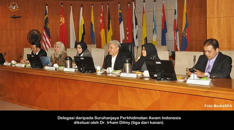 PUTRAJAYA, 5 Disember ----- Suruhanjaya Perkhidmatan Awam Malaysia (SPA) telah menerima lawatan daripada Suruhanjaya Perkhidmatan Awam Indonesia, semalam. Ketibaan delegasi seramai 6 (enam) pegawai yang diketuai oleh Wakil Ketua Komisi Aparatur Sipil Negara (KASN) Dr. Irham Dilmy disambut oleh Setiausaha SPA, YBhg. Dato’ Zainal Abidin Ahmad. Satu sesi taklimat mengenai Suruhanjaya Perkhidmatan Awam Malaysia telah disampaikan oleh Pengerusi SPA, YBhg. Tan Sri Arpah Abdul Razak . Turut hadir Timbalan Setiausaha (Perkhidmatan), Encik Ikhbal Hanam Mukras dan pegawai-pegawai kanan SPA . ----- MediaSPA