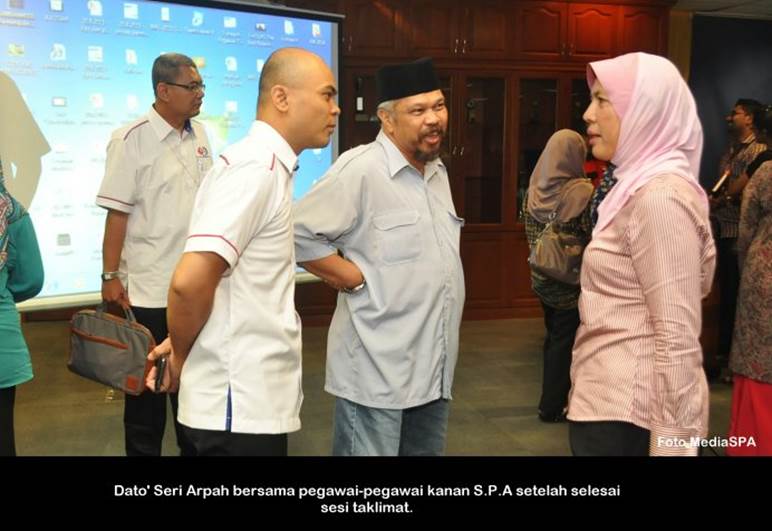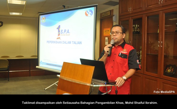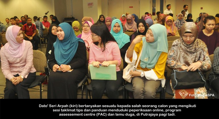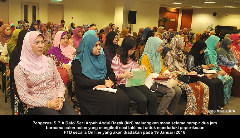 PUTRAJAYA 16 Jan ----- Suruhanjaya Perkhidmatan Awam Malaysia (S.P.A) telah mengadakan sesi taklimat tips dan panduan menduduki peperiksaan “online”, program assessement centre (PAC) dan temu duga untuk jawatan Pegawai Tadbir Dan Diplomatik (PTD). Sesi taklimat juga diadakan di Pusat temu duga S.P.A di Alor Setar Kedah, Johor Baharu, Kota Kinabalu Sabah dan di Kuching Sarawak. Sementara itu di Pusat temu duga S.P.A di Kuantan Pahang sesi taklimat telah disampaikan oleh Setiausaha S.P.A, Dato’ Zainal Abidin Ahmad. Pengerusi S.P.A, Dato’ Seri Arpah Abdul Razak hari ini turut meninjau perjalanan sesi taklimat yang diadakan di Putrajaya dan turut dihadiri Timbalan Setiausaha (Pengambilan) Tuan Haji Abdullah Tahir . ----- MediaSPA