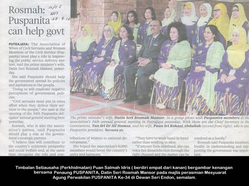 PUTRAJAYA, 26 April------ Timbalan Setiausaha (Perkhidmatan) Puan Salmah Idris yang juga Ahli Jawatankuasa Kerja Tertinggi dan Biro Keusahawanan telah menerima Anugerah Ahli PUSPANITA Cemerlang peringkat Kebangsaan pada satu majlis Mesyuarat Agung Perwakilan PUSPANITA Ke-34 yang telah dirasmikan oleh Penaung PUSPANITA, Datin Seri Rosmah Mansor di Putrajaya semalam. Turut hadir pada majlis itu Ketua Setiausaha Negara, Tan Sri Dr. Ali Hamsa dan yang Di Pertua PUSPANITA Puan Seri Rohani Abdullah. ------ MediaSPA