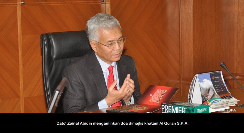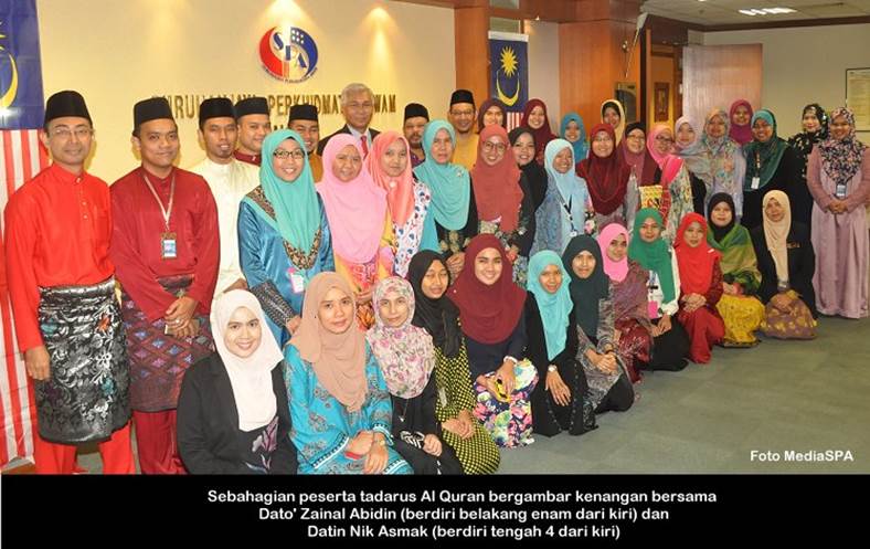 SPA, 1 Julai------ Suruhanjaya Perkhidmatan Awam Malaysia (S.P.A) hari ini telah mengadakan majlis khatam Al Quran 1437H/2016M. Majlis anjuran bersama PASPA dan PUSPANITA turut dihadiri Setiausaha Dato’ Zainal Abidin Ahmad dan Datin Nik Asmak Nik Mahmood. Hadir Sama Timbalan Setiausaha (Pengambilan) Tuan Haji Abdullah Tahir. Seramai 51 orang peserta telah memeriahkan tadarus yang bermula sejak awal bulan Ramadan. ------ MediaSPA