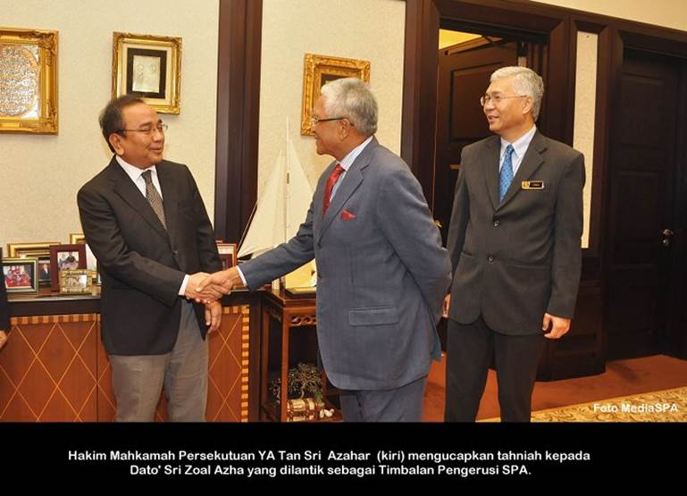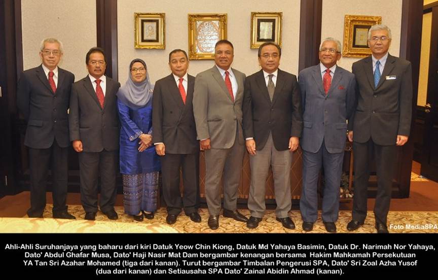 PUTRAJAYA, 30 November ------ Suruhanjaya Perkhidmatan Awam Malaysia (SPA) telah menerima enam (6) orang Ahli Suruhanjaya yang baharu semalam. Ahli-Ahli Suruhanjaya tersebut adalah YBhg. Dato’ Sri Zoal Azha Yusof (Timbalan Pengerusi), YBhg. Datuk Yeow Chin Kiong (Ahli), YBhg. Datuk Md Yahaya Masimin (Ahli), YBhg. Dato’ Abdul Ghafar Musa (Ahli), YBhg. Dato’ Haji Nasir Mat. Dam (Ahli) dan YBhg. Datuk Dr. Narimah Yahaya (Ahli). Majlis Angkat Sumpah telah dijalankan semalam dihadapan Hakim Mahkamah Persekutuan, YA Tan Sri Azahar Mohamed di Istana Kehakiman dan turut disaksikan oleh Setiausaha SPA , YBhg. Datuk Zainal Abidin Ahmad.  ------  MediaSPA