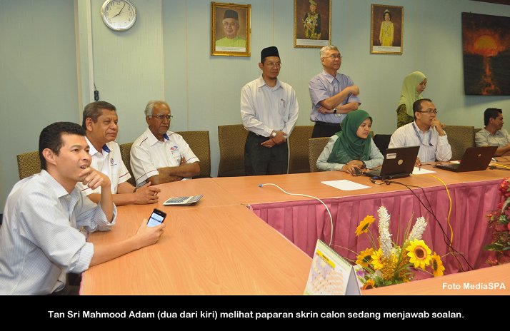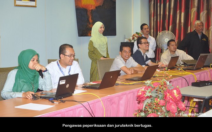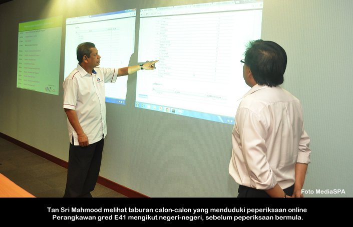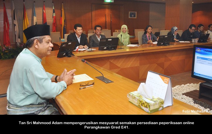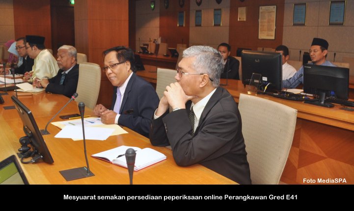 PUTRAJAYA, 6 Feb ------ Suruhanjaya Perkhidmatan Awam Malaysia (S.P.A) telah mengadakan peperiksaan online bagi jawatan Perangkawan Gred E41 yang diadakan pada Jumaat. Seramai 1,917 calon telah menduduki peperiksaan yang bermula jam 8.00 malam dan berakhir 10.15 malam. Turut hadir menyaksikan perjalanan peperiksaan, Pengerusi S.P.A Tan Sri Mahmood Adam dan Timbalan Dato' R. Segarajah sementara pusat peperiksaan pada kali ini telah diadakan di Putrajaya. Dalam satu kenyataan yang dikeluarkan oleh S.P.A, keputusan akan diketahui pada Isnin Jam 12.00 tengah hari selapas Mesyuarat Suruhanjaya pada hari berkenaan. ------MediaSPA
