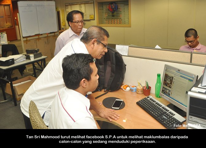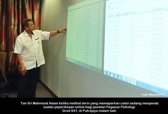 PUTRAJAYA, 26 Mac ------ Suruhanjaya Perkhidmatan Awam Malaysia (S.P.A) telah mengadakan peperiksaan online bagi jawatan Pegawai Psikologi Gred S41 malam tadi. Seramai 2,656 calon hadir dan menduduki peperiksaan, ini termasuk calon-calon yang berada di lima (5) buah Negara iaitu Singapura, Brunei, Australia, New Zealand, dan Amerika Syarikat. Menurut Pengerusi S.P.A Tan Sri Mahmood Adam, perjalanan peperiksaan berjalan dengan lancar dan keputusan peperiksaan akan diumumkan pada 30 Mac 2015 (Isnin) jam 12.00 tengah hari. Calon-calon boleh melihat keputusan di portal rasmi S.P.A www.spa.gov.my. ------ MediaSPA