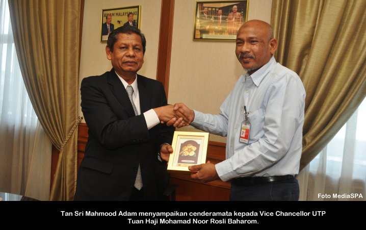 PUTRAJAYA, 8 April ------ Pengerusi S.P.A Tan Sri Mahmood Adam pagi ini telah menerima kunjungan daripada Universiti Teknologi Petronas (UTP). Delegasi seramai lima (5) orang diketuai oleh Vice Chancellor UTP Tuan Haji Mohamad Noor Rosli Baharom. Satu taklimat mengenai S.P.A telah disampaikan oleh Tan Sri Mahmood Adam. ------MediaSPA