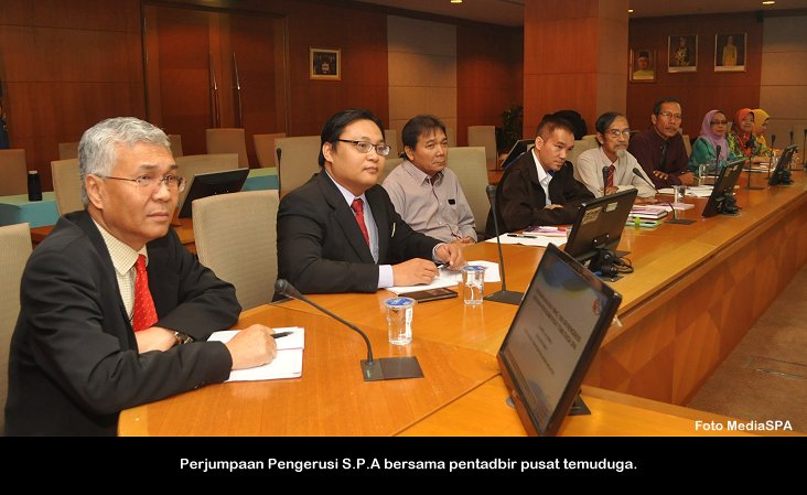 PUTRAJAYA, 15 April ------ Pengerusi S.P.A, Tan Sri Mahmood Adam sebentar tadi mengadakan perjumpaan dan mempengerusikan Mesyuarat bersama pentadbir pusat temu duga S.P.A. Antara lain perbincangan dalam mesyuarat ialah mengenai operasi pusat temu duga yang dibuka pada setiap hari bekerja bagi memudahkan pelanggan berurusan seperti pendaftaran borang online serta urusan berkaitan S.P.A. Kini terdapat 14 pusat temu duga S.P.A iaitu di Putrajaya, Kuala Lumpur, Kota Baharu, Kuantan, Ipoh, Alor Setar, Johor Bahru, Melaka, Kuching, Sibu, Miri, Kota Kinabalu, Tawau dan Sandakan ------ MediaSPA