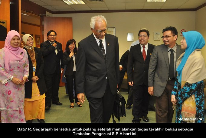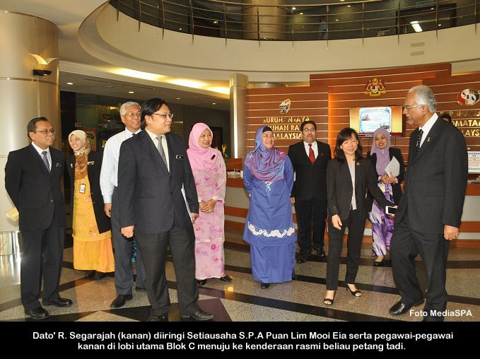 PUTRAJAYA, 3 Jun ------ Hari ini merupakan hari terakhir Dato’ R.Segarajah bertugas sebagai Timbalan Pengerusi S.P.A setelah dilantik sebagai Ahli Suruhanjaya pada 4 Jun 2012. Beliau yang ditemui Setiausaha S.P.A Puan Lim Mooi Eia serta pegawai-pegawai kanan dan kakitangan pejabat itu petang tadi mengucapkan terima kasih atas kerjasama yang diberikan kepadanya termasuk semua warga S.P.A selama beliau bertugas di sini. ------   MediaSPA