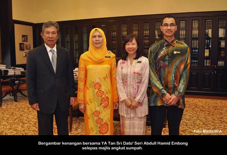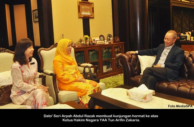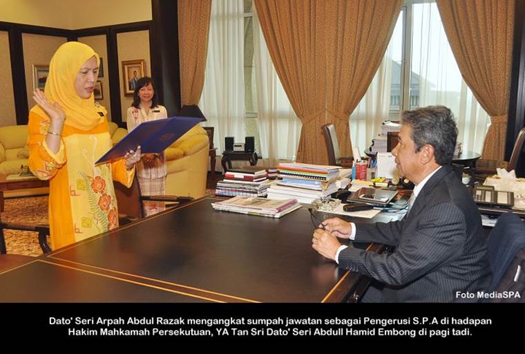 PUTRAJAYA, 23 Julai ------ Dato’ Seri Arpah Abdul Razak dilantik sebagai Pengerusi Suruhanjaya Perkhidmatan Awam Malaysia (S.P.A) yang baharu bermula hari ini setelah majlis angkat sumpah jawatan dan setia di hadapan Hakim Mahkamah Persekutuan, YA Tan Sri Dato’ Seri Abdull Hamid Embong di Istana Kehakiman pagi tadi. Turut mengiringi ke majlis angkat sumpah, Setiausaha S.P.A Puan Lim Mooi Eia. Seterusnya Dato’ Seri Arpah membuat kunjungan hormat ke atas Ketua Hakim Negara, YAA Tun Arifin Zakaria. ------MediaSPA