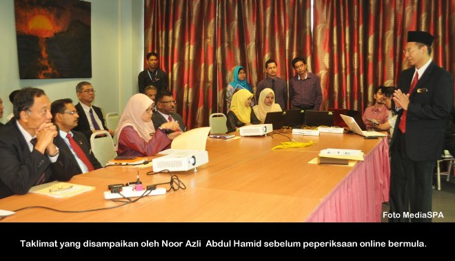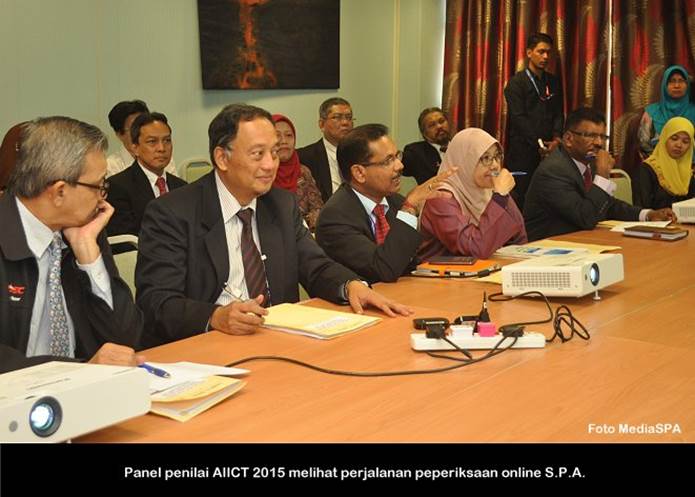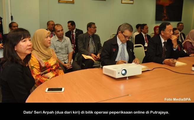PUTRAJAYA, 29 Julai ------ Suruhanjaya Perkhidmatan Awam Malaysia (S.P.A) hari ini telah menjalankan peperiksaan online bagi tiga (3) jawatan iaitu Pereka Gred B17, Jurufotografi Gred B27 dan Pereka Gred B41. Pengerusi S.P.A Dato’ Seri Arpah Abdul Razak hadir ke bilik operasi peperiksaan di Putrajaya dan menyaksikan perjalanan peperiksaan yang bermula jam 10.00 pagi tadi. Turut hadir Setiausaha Puan Lim Mooi Eia dan panel penilai Anugerah Inovasi Teknologi Maklumat dan Komunikasi (AIICT) yang diketuai oleh Timbalan Ketua Pengarah (TMK) MAMPU, Dr. Suhazimah Dzazali. Terdahulu sesi taklimat peperiksaan online S.P.A kepada delegasi Panel (AIICT) 2015 telah disampaikan oleh Puan Lim Mooi Eia. ------MediaSPA