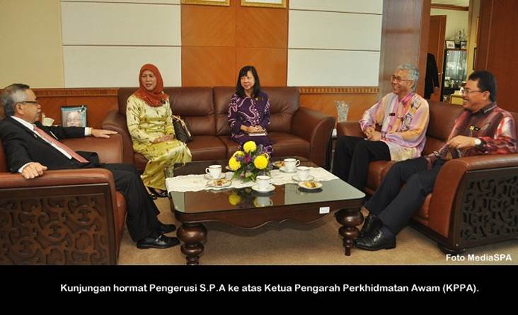 PUTRAJAYA, 30 Julai ------ Pengerusi S.P.A Dato’ Seri Arpah Abdul Razak pagi ini membuat kunjungan hormat ke atas Ketua Pengarah Perkhidmatan Awam (KPPA), Tan Sri Mohamad Zabidi Zainal di pejabatnya di Putrajaya. Turut hadir Timbalan Ketua Pengarah Perkhidmatan Awam (P), Dato’ Jalil Marzuki, Setiausaha S.P.A Puan Lim Mooi Eia dan Timbalan Setiausaha (Pengambilan) En Zainal Abidin Ahmad. Dato’ Seri Arpah turut mengadakan perbincangan bersama-sama Tan Sri Mohamad Zabidi Zainal selama 40 minit. ------MediaSPA