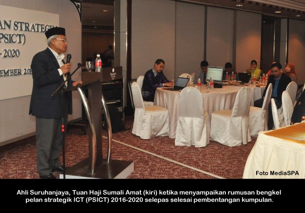 MELAKA, 19 Nov------ esi pembentangan kumpulan dalam bengkel pelan strategik ICT (PSICT) S.P.A 2016-2020 iaitu semakan Visi dan Misi ICT, semakan teras strategik ICT dan objektif, telah selesai sebentar tadi. Ahli Suruhanjaya, Tuan Haji Sumali Amat turut menyampaikan rumusan serta pandangan. Hadir sama Setiausaha S.P.A Dato’ Zainal Abidin Ahmad, Timbalan Setiausaha (Perkhidmatan) Puan Salmah Idris, Timbalan Setiausaha (Pengambilan) Tuan Haji Abdullah Tahir, pegawai-pegawai kanan S.P.A. Bengkel yang bermula selasa lepas, berakhir hari ini. ------ MediaSPA