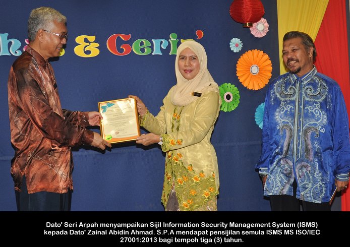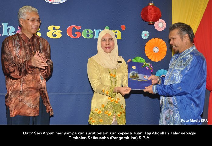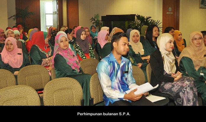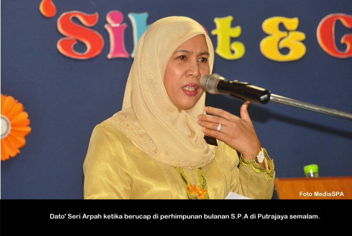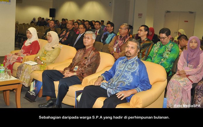PUTRAJAYA, 26 Nov ------ Pengerusi S.P.A, Dato’ Seri Arpah Abdul Razak menyeru penjawat awam supaya mengamalkan cara hidup sihat kerana berupaya meningkatkan daya tumpuan dan fokus seseorang ke atas pelaksanaan tugasan seharian. Beliau berkata demikian dalam ucapan di perhimpunan bulanan Suruhanjaya Perkhidmatan Awam (S.P.A) di Putrajaya semalam. Katanya lagi “tubuh badan yang sihat, sudah tentu akan menyumbang kepada kecerdasan emosi dan pemikiran”. Turut hadir Setiausaha S.P.A, Dato’ Zainal Abidin Ahmad, Timbalan Setiausaha (Perkhidmatan) Puan Salmah Idris, Timbalan Setiausaha (Pengambilan) Tuan Haji Abdullah Tahir serta warga S.P.A.. ------  MediaSPA