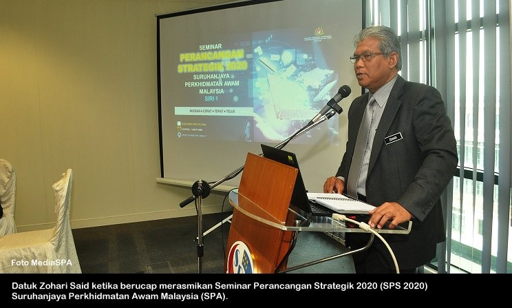 PUTRAJAYA 30 Okt ----- Suruhanjaya Perkhidmatan Awam Malaysia (SPA) telah mengadakan Seminar Perancangan Strategik 2020 (SPS 2020) Suruhanjaya Perkhidmatan Awam Malaysia (SPA) Siri 1. Seminar telah dirasmikan oleh Setiausaha SPA, Datuk Zohari Said. Hadir sama Timbalan Setiausaha (Perkhidmatan) Tuan Haji Ikhbal Hanam Mukras. Tujuan penganjuran SPS 2020 SPA adalah untuk mengenalpasti isu-isu yang timbul dalam semua urusan SPA dan merangka program penambahbaikan / inisiatif inovasi bagi meningkatkan penyampaian perkhidmatan dengan mempermudahkan pelanggan, meningkatkan kecekapan, ketepatan serta ketelusan SPA ----- MediaSPA