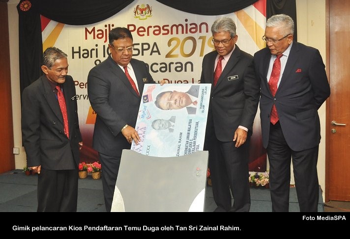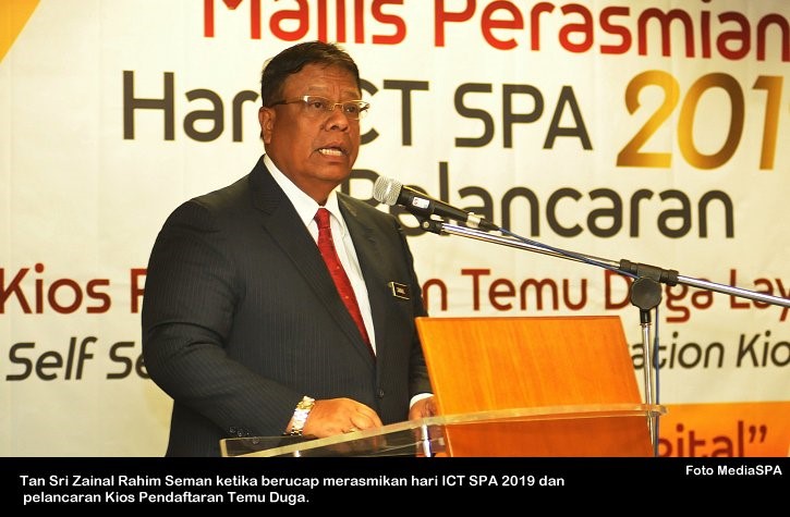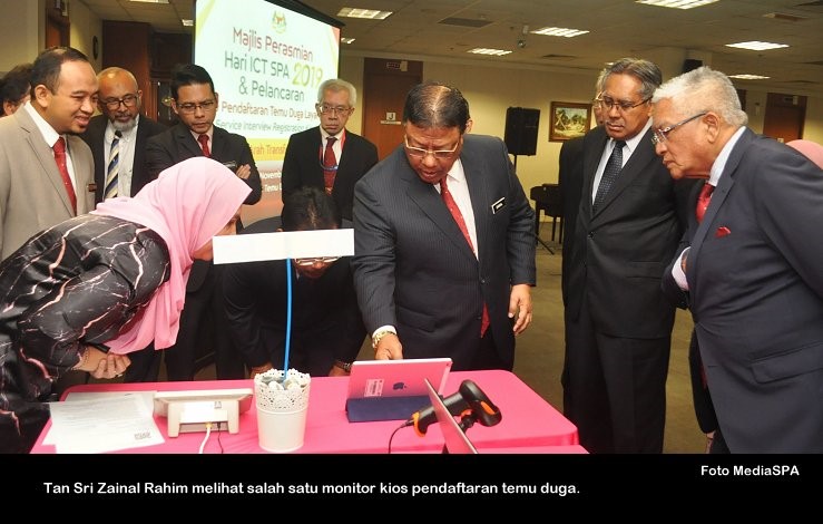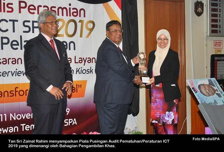 PUTRAJAYA 11 Nov ----- Pengerusi SPA, Tan Sri Zainal Rahim Seman telah merasmikan pelancaran Hari ICT SPA 2019 dan Kios Pendaftaran Temu Duga di Putrajaya. Turut hadir Timbalan Pengerusi SPA, Dato’ Sri Zoal Azha Yusof, Ahli-Ahli Suruhanjaya, Setiausaha SPA, Datuk Zohari Said pegawai-pegawai kanan dan warga SPA. Pengerusi SPA juga turut menyampaikan Piala Pusingan Audit Pematuhan/Peraturan ICT (Bahagian) tahun 2019 kepada Bahagian Pengambilan Khas. ----- MediaSPA