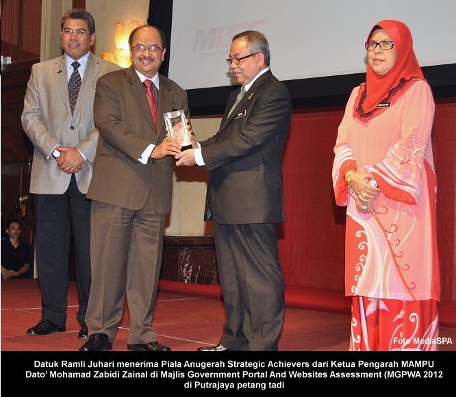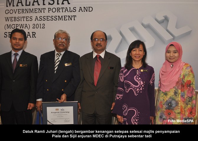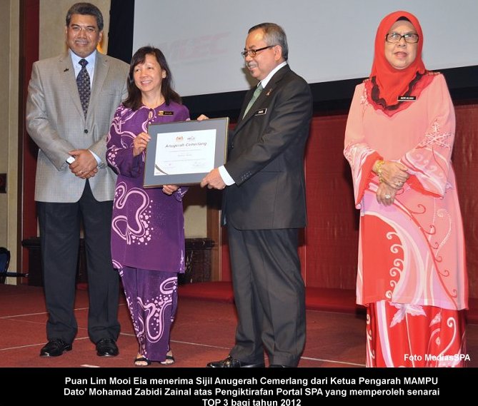 PUTRAJAYA 12 Dis ----- Suruhanjaya Perkhidmatan Awam Malaysia (SPA) hari ini telah menerima Piala dan Sijil Penarafan Portal 5 Bintang. SPA yang menerima penarafan dan penilaian Portal “Top 3” adalah anjuran Multimedia Development Corporation (MDEC) dengan kerjasama MAMPU yang diadakan di Putrajaya Marriot Hotel petang ini. Setiausaha SPA, YBhg. Datuk Ramli Juhari telah menerima Piala yang disampaikan oleh oleh Ketua Pengarah MAMPU, YBhg. Dato’ Mohamad Zabidi Zainal. Hadir sama Timbalan Setiausaha (Perkhidmatan), Puan Lim Mooi Eia dan Setiausaha Bahagian Pengurusan Maklumat, Encik Kamarudzzaman Bin Hassan. Dalam satu laporan yang dikeluarkan oleh MDEC, Portal SPA Malaysia telah menduduki tempat ke-3 daripada 554 Agensi seluruh Malaysia yang di nilai pada tahun 2012. ----- MediaSPA