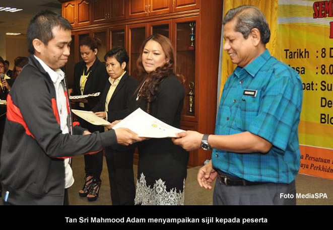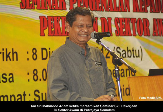 SPA 9 Dis -----Suruhanjaya Perkhidmatan Awam Malaysia (SPA) telah mengadakan Seminar Pengenalan Kepada Skil Pekerjaan di Sektor Awam. Seminar sehari yang berlangsung di Pusat Temu SPA Putrajaya semalam adalah kerjasama antara SPA bersama Persatuan Profesional Melayu Malaysia. Seminar yang dihadiri seramai 175 peserta itu telah dirasmikan oleh Pengerusi SPA, YBhg. Tan Sri Mahmood Adam. Hadir sama, Setiausaha SPA, YBhg. Datuk Ramli Juhari dan pegawai-pegawai kanan SPA. Tujuan seminar ini diadakan adalah untuk membantu calon-calon yang memohon pekerjaan dengan SPA supaya memperlengkapkan diri dengan ilmu dan kemahiran skil pekerjaan termasuklah teknik-teknik menghadiri temu duga. Satu sidang media juga diadakan di tempat yang sama sejurus selepas majlis perasmian.----- MediaSPA