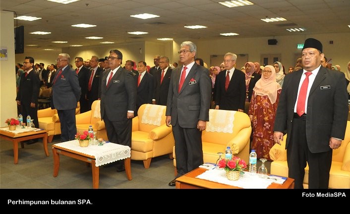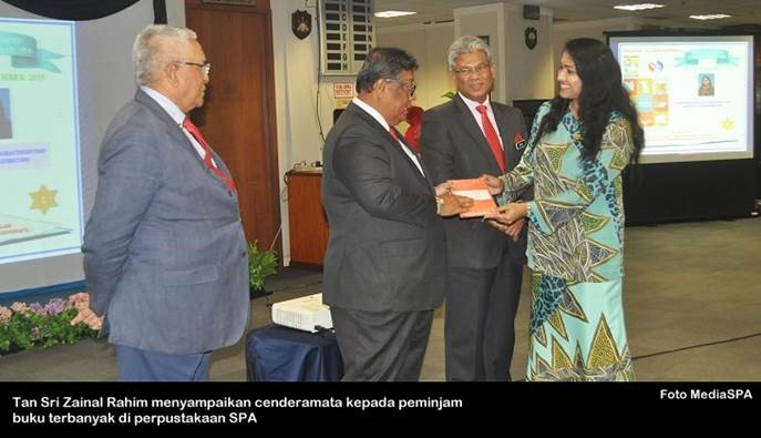 PUTRAJAYA 16 Dis ----- Suruhanjaya Perkhidmatan Awam Malaysia (SPA) telah mengadakan perhimpunan bulanan, semalam. Majlis dihadiri Pengerusi SPA, Tan Sri Zainal Rahim Seman, Timbalan Pengerusi, Dato' Sri Zoal Azha Yusof, Ahli-Ahli Suruhanjaya, Setiausaha SPA, Datuk Zohari Said pegawai-pegawai kanan serta warga SPA. Pengerusi SPA juga turut menyampaikan kit kepada kakitangan baharu dan cenderamata kepada peminjam buku di Perpustakaan SPA. Pada majlis itu juga satu pengumuman “ Buku Tatacara Tindakan Tatatertib” boleh dimuat turun dari portal rasmi SPA. ----- MediaSPA