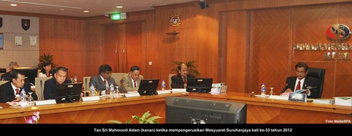 SPA 15 Oktober ---- Suruhanjaya Perkhidmatan Awam Malaysia (SPA) hari ini telah mengadakan Mesyuarat Suruhanjaya kali ke-33 bagi tahun 2012. Mesyuarat telah dipengerusikan oleh YBhg. Tan Sri Mahmood Bin Adam, Pengerusi SPA. Mesyuarat mingguan yang diadakan pada setiap Hari Isnin ini juga turut dihadiri oleh Timbalan Pengerusi, YBhg. Dato' Segarajah Ratnalingam, Ahli-Ahli Suruhanjaya, Setiausaha SPA, YBhg. Datuk Ramli Juhari dan pegawai-pegawai kanan SPA. Mesyuarat pada hari ini telah membincangkan dan mempertimbangkan empat (4) Kertas Tindakan Tatatertib, 12 Kertas Rayuan Tatatertib, lapan (8) Kertas Rayuan Naik Pangkat dan Sembilan (9) Kertas Pelantikan Tetap melibatkan seramai 356 calon lantikan tetap. Selain itu, sebanyak 1,737 orang pegawai lantikan SPA telah diberi pengesahan dalam perkhidmatan dan pemberian taraf berpencen. Mesyuarat yang berakhir tengah hari tadi telah diadakan di bilik Mesyuarat Suruhanjaya Aras 10. ----- MediaSPA