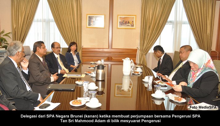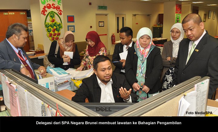 SPA 10 Oktober ---- Suruhanjaya Perkhidmatan Awam Negara Brunei diketuai oleh Setiausaha SPA Brunei, Awang Salminan Haji Burut telah mengadakan lawatan kerja ke Suruhanjaya Perkhidmatan Awam Malaysia. Lawatan kerja selama (tiga) 3 hari ini adalah untuk melihat dengan lebih dekat pelaksanaan proses urusan pengambilan dan perkhidmatan di SPA Malaysia dan seterusnya meningkatkan lagi kerjasama di antara SPA Brunei dan SPA Malaysia. Terdahulu dari itu, satu kunjungan hormat kepada Pengerusi SPA, YBhg. Tan Sri Mahmood Adam telah diadakan di Bilik Mesyuarat Pengerusi. Sejurus selepas perjumpaan bersama Pengerusi, taklimat ringkas mengenai fungsi-fungsi SPA Malaysia telah disampaikan oleh Setiausaha SPA Malaysia, YBhg. Datuk Ramli Juhari bertempat di bilik Mesyuarat Suruhanjaya. Delegasi SPA Brunei seramai empat (4) orang itu juga dibawa ke Bahagian Pengambilan, Bahagian Pengambilan Khas, Bahagian Perkhidmatan, Bahagian Peperiksaan dan Bahagian Pengurusan Maklumat untuk mengetahui dengan lebih lanjut bidang tugas setiap bahagian. ----- MediaSPA