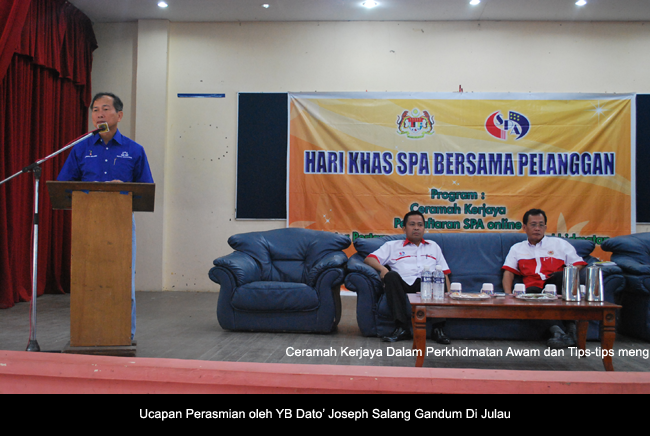 Program Hari Khas SPA Bersama Pelanggan di Daerah Julau telah dirasmikan oleh YB Dato' Joseph Salang Gandum, Timbalan Menteri Kementerian Penerangan, Komunikasi dan Kebudayaan merangkap Ahli Parlimen Julau. Hadir sama Setiausaha Bahagian Urus Setia Cawangan Sarawak, Encik Mohd Saiful Sungkih Bin Abdullah, pegawai-pegawai SPA serta wakil-wakil jabatan. ----- MediaSPA