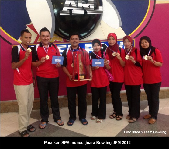 PUTRAJAYA 24 September------ Pasukan Bowling Suruhanjaya Perkhidmatan Awam Malaysia (SPA) muncul Johan Pertandingan Bowling Jabatan Perdana Menteri 2012 yang berlangsung di ARL Powerbowl, Alamanda Putrajaya Sabtu lepas. SPA telah menjadi Johan bagi Kategori Lelaki dan Wanita daripada 24 pasukan yang mewakili Kementerian dan Jabatan di bawah Jabatan Perdana Menteri. SPA juga dinobatkan sebagai Johan Keseluruhan Pertandingan dengan memperoleh 3,704 jatuhan pin. Hadiah telah disampaikan oleh Setiausaha Bahagian Kewangan dan Pembangunan JPM, Encik Zolkopli Dahalan. ----- MediaSPA