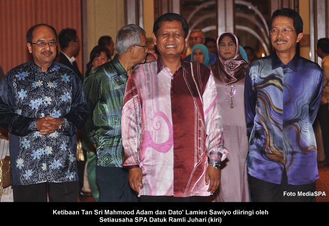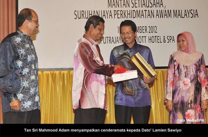 PUTRAJAYA 20 September ----- Suruhanjaya Perkhidmatan Awam Malaysia (SPA) telah mengadakan Majlis Setulus Ingatan Sejambak Kasih malam tadi. Majlis yang berlangsung di Hotel Marriot, Putrajaya tersebut diadakan sempena pertukaran mantan Setiausaha SPA, YBhg. Dato' Lamien Sawiyo. Beliau telah bertukar ke Parlimen berkuatkuasa pada 11 September 2012 yang lalu. Hadir sama, Pengerusi SPA, YBhg. Tan Sri Mahmood Bin Adam dan Ahli-Ahli Suruhanjaya. Turut hadir Setiausaha SPA, YBhg. Datuk Ramli Juhari, Timbalan Setiausaha (Perkhidmatan) Puan Lim Mooi Eia, Timbalan Setiausaha (Pengambilan) Encik Zainal Abidin Ahmad serta warga SPA. Majlis turut diserikan dengan persembahan tarian daripada Jabatan Kesenian dan Kebudayaan serta persembahan nyanyian daripada warga SPA. ----- MediaSPA