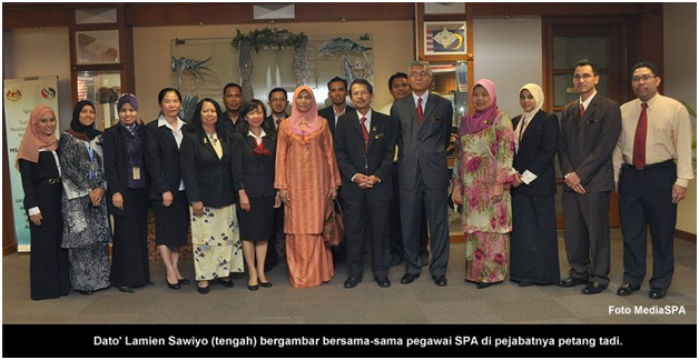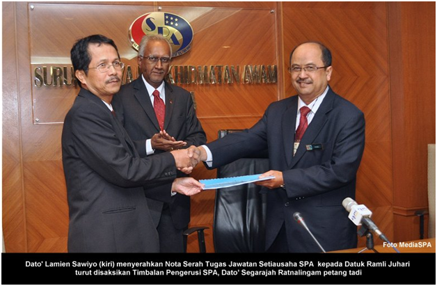 SPA 10 September ----- Suruhanjaya Perkhidmatan Awam Malaysia (SPA) hari ini telah mengadakan Majlis Penyerahan Dan Akuan Terima Nota Serah Tugas Jawatan Setiausaha SPA yang ke-16, YBhg. Dato’ Lamien Bin Sawiyo kepada Setiausaha SPA yang baharu. YBhg. Dato’ Lamien Bin Sawiyo akan bertukar ke Parlimen Malaysia sebagai Ketua Pentadbir Parlimen berkuatkuasa pada 11 September 2012. Beliau yang mula bertugas di SPA pada 2.2.2008, digantikan oleh Setiausaha SPA yang baharu iaitu YBhg. Datuk Ramli Bin Juhari juga berkuatkuasa pada 11 September 2012. Majlis penyerahan tugas jawatan tersebut telah berlangsung dihadapan Timbalan Pengerusi SPA, YBhg. Dato’ Segarajah Ratnalingam. ----- MediaSPA