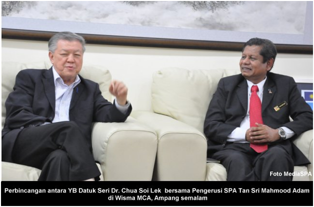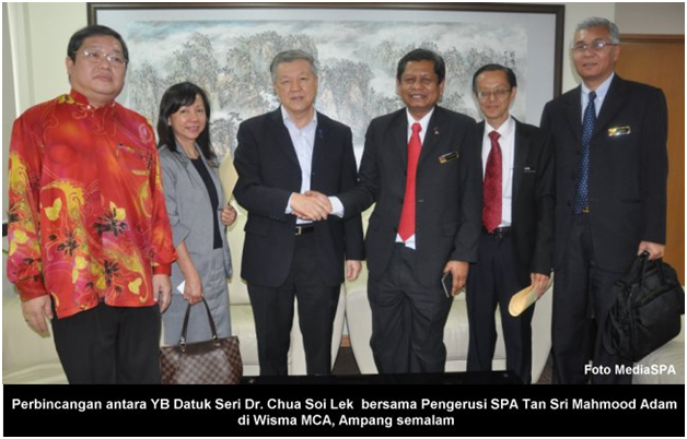 KUALA LUMPUR 11 Ogos------ Pengerusi Suruhanjaya Perkhidmatan Awam Malaysia (SPA), YBhg. Tan Sri Mahmood Adam telah mengadakan perjumpaan dengan Presiden Malaysia Chinese Association (MCA), YB Datuk Seri Dr. Chua Soi Lek di Wisma MCA, Jalan Ampang. Perjumpaan yang diadakan petang semalam adalah merupakan salah satu daripada engagement SPA dalam usaha untuk menarik minat kaum Cina menyertai Perkhidmatan Awam. Turut hadir dalam perjumpaan tersebut adalah Ahli Suruhanjaya, Encik Boon Jon Lin, Timbalan Setiausaha (Perkhidmatan), Puan Lim Mooi Eia dan Setiausaha Bahagian Pengambilan, Encik Zainal Abidin Ahmad. ------MediaSPA