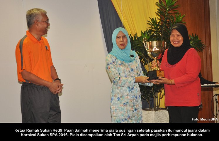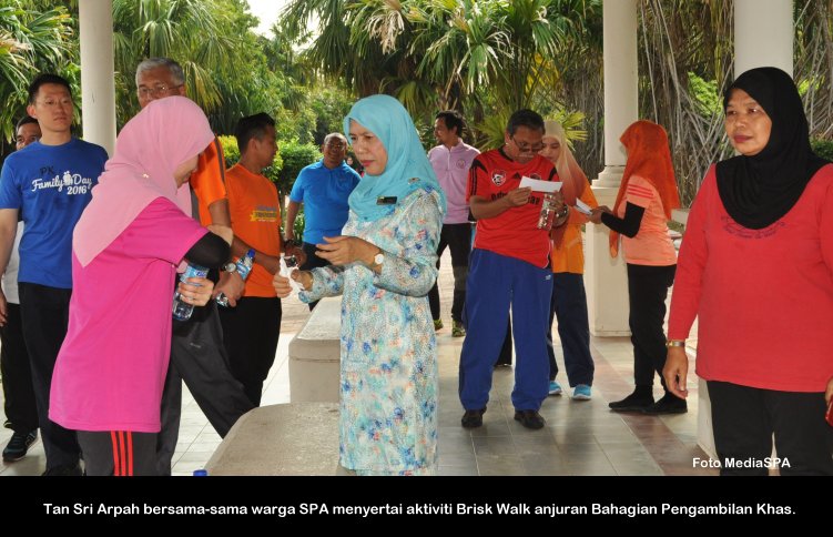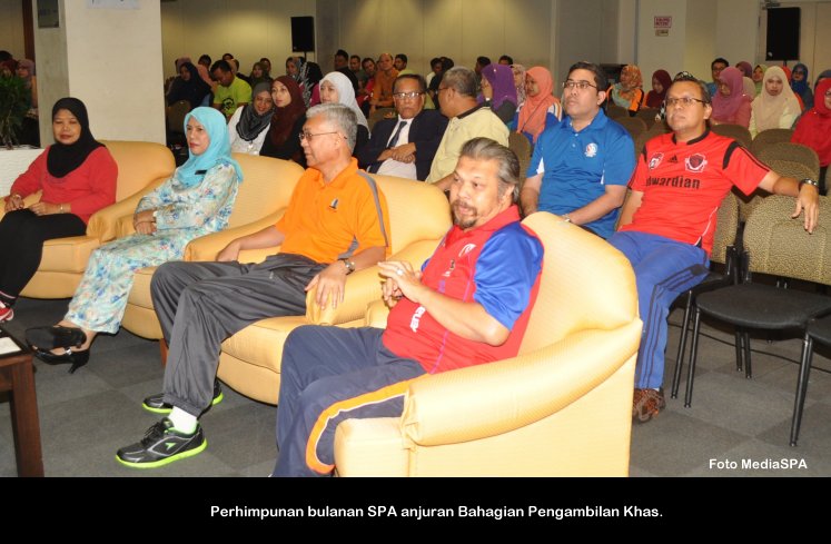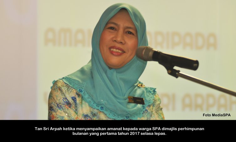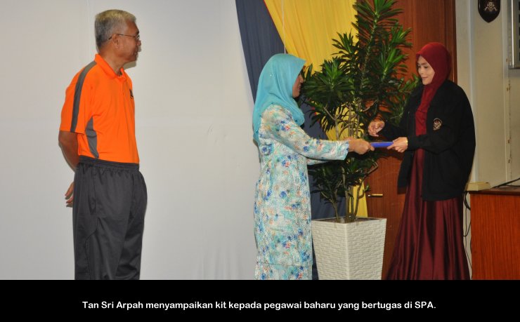 PUTRAJAYA, 10 Januari ----- Pengerusi SPA, YBhg. Tan Sri Arpah Abdul Razak berkata pelbagai kejayaan dan pencapaian yang membanggakan SPA telah dikecapi sepanjang tahun 2016. Antaranya ialah SPA telah menerima 1,561,206 permohonan individu untuk memasuki perkhidmatan awam. Daripada jumlah tersebut, seramai 25,046 orang calon berjaya dilantik secara tetap dan 34,640 orang calon telah dilantik secara kontrak. Beliau berkata demikian ketika menyampaikan amanat dalam Perhimpunan Bulanan SPA pertama di Putrajaya Selasa lepas. Suruhanjaya Perkhidmatan Awam juga telah membuka Pusat Temu Duga baharu di Kuala Terengganu serta pemindahan Pusat Temu Duga SPA ke UTC Perak yang merupakan langkah penjimatan kos sewaan. Di samping itu juga SPA telah berjaya mengekalkan pensijilan semula MS ISO 9001:2008, perkongsian pintar sistem eSURAT bersama Jabatan Perkhidmatan Awam (JPA), perkongsian pintar sistem eCirculation antara SPA dan Suruhanjaya Perkhidmatan Awam Negeri Sarawak, pelancaran aplikasi mobile mySPA8i dan pelancaran MyGim atau aplikasi pemarkahan temu duga secara online. SPA juga telah berjaya mendapat tempat kedua bagi kategori Anugerah Inovasi Teknologi Maklumat dan Komunikasi (AIICT) 2016 sempena Anugerah Inovasi Sektor Awam (AISA). Pada peringkat kejuaraan sukan dan sosial pula, SPA muncul Juara Pertandingan Bola Jaring sempena sukan MAKSWIP 2016. Turut hadir dalam perhimpunan itu, Setiausaha SPA, YBhg. Dato’ Zainal Abidin Ahmad, Timbalan Setiausaha (Perkhidmatan) Puan Salmah Idris, Timbalan Setiausaha (Pengambilan) Tuan Haji Abdullah Tahir dan pegawai-pegawai SPA. MediaSPA