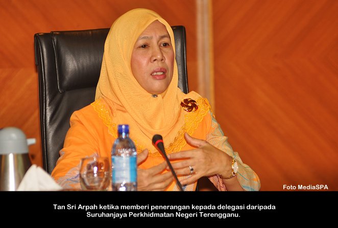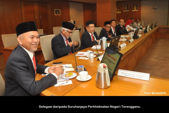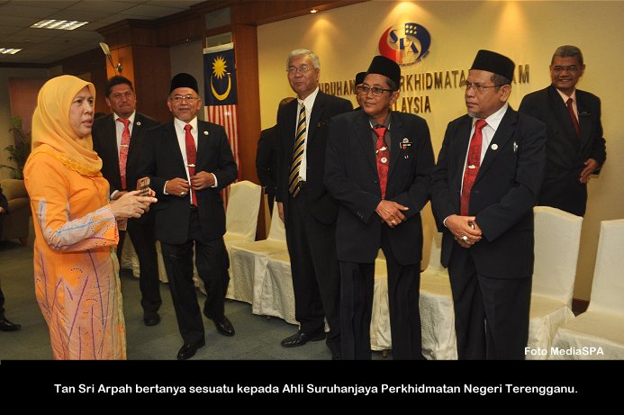 PUTRAJAYA, 22 Mac ------ Suruhanjaya Perkhidmatan Awam Malaysia (SPA) telah menerima lawatan kerja daripada Suruhanjaya Perkhidmatan Negeri Terengganu, semalam. Delegasi yang diketuai oleh Pengerusi Suruhanjaya Perkhidmatan Negeri Terengganu, YBhg. Dato’ Haji Mohd @ Daik Ngah turut diiringi oleh Setiausaha dan Ahli-Ahli Suruhanjaya Perkhidmatan Negeri Terengganu. Ketibaan delegasi telah disambut oleh Pengerusi SPA Malaysia, YBhg. Tan Sri Arpah Abdul Razak. Satu sesi taklimat mengenai fungsi-fungsi SPA Malaysia dan sistem-sistem online yang digunakan oleh SPA telah disampaikan oleh Setiausaha SPA, YBhg. Datuk Zainal Abidin Ahmad. ------ MediaSPA