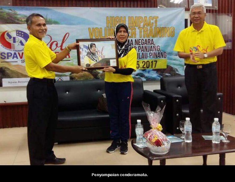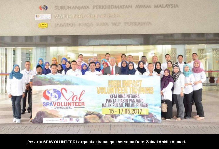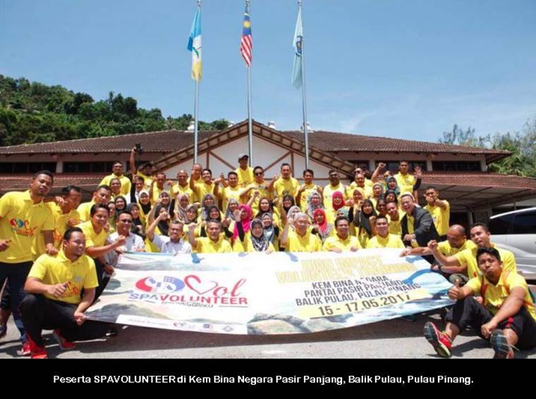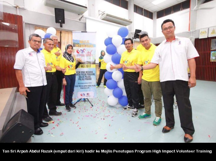 BALIK PULAU, PULAU PINANG, 17 Mei ----- YBhg. Tan Sri Arpah Abdul Razak telah merasmikan Majlis Penutupan Program High Impact Volunteer Training (HIVT) SPA Volunteer (SPAVOL) yang telah diadakan pada 15-17 Mei 2017 bertempat di Kem Bina Negara, Pantai Pasir Panjang, Balik Pulau, Pulau Pinang. Pada majlis yang sama juga, YBhg. Tan Sri Arpah selaku Penaung SPAVOL turut merasmikan Penubuhan SPA Volunteer (SPAVOL). Turut hadir YBhg. Datuk Hj. Ibrahim Bin Saad, Ketua Pengarah Biro Tatanegara dan YBhg. Dato' Zainal Abidin Bin Ahmad, Setiausaha SPA merangkap Penasihat SPAVOL. Terdahulu sebelum itu, acara pelepasan peserta Program HIVT SPAVOL telah disempurnakan oleh YBhg. Dato' Zainal Abidin Ahmad pada 15 Mei 2017 yang lalu bertempat di perkarangan lobi SPA, Putrajaya. SPA Volunteer (SPAVOL) adalah merupakan gabungan di antara sukarelawan warga SPA dan orang awam yang mendaftar dengan SPA untuk menjalankan kerja-kerja kebajikan dan kesukarelawan dalam membantu masyarakat yang memerlukan sama ada di dalam atau di luar negara. MediaSPA