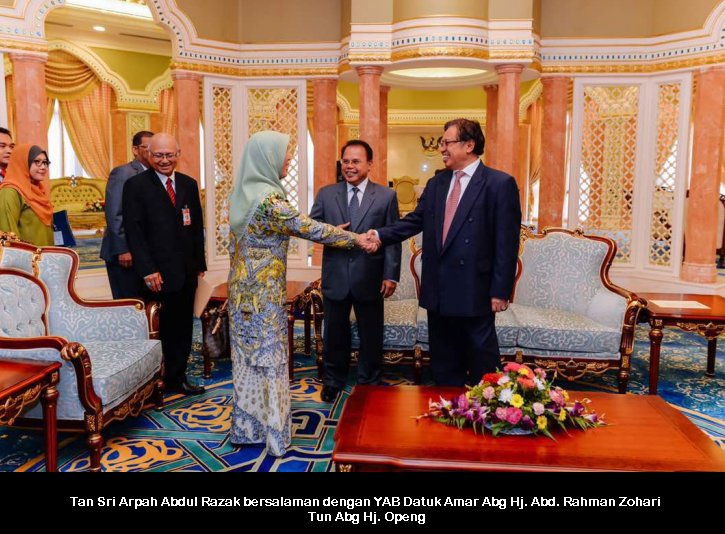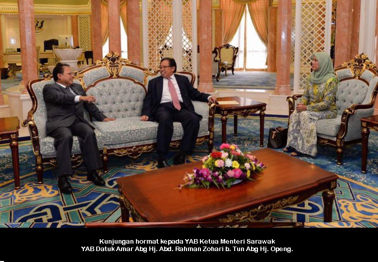 SARAWAK, 19 Mei ----- YAB Datuk Amar Abg Hj. Abd. Rahman Zohari Tun Abg Hj. Openg, Ketua Menteri Sarawak hari ini telah menerima kunjungan hormat daripada YB Datuk Joseph Entulu Anak Belaun, Menteri di Jabatan Perdana Menteri. Turut serta, YBhg. Tan Sri Arpah Abdul Razak, Pengerusi Suruhanjaya Perkhidmatan Awam Malaysia (SPA), YBhg. Tan Sri Dr. Haili Dolhan, Pengerusi Suruhanjaya Perkhidmatan Pelajaran (SPP) dan YBhg. Dato’ Dr. Mazlan Yusoff, Ketua Pengarah MAMPU. Ini adalah merupakan kunjungan hormat pertama ke atas YAB Ketua Menteri Sarawak selepas dilantik menjadi Ketua Menteri Sarawak yang baru. Kunjungan hormat ini bertujuan untuk mengeratkan silatulrahim diantara YAB Ketua Menteri bersama YB Menteri, SPA Malaysia, SPP dan MAMPU disamping berkongsi pengalaman dan bertukar-tukar pandangan bagi mempertingkatkan lagi prestasi di organisasi masing-masing. MediaSPA