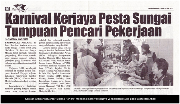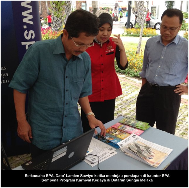 SPA 11 Jun ------ Suruhanjaya Perkhidmatan Awam Malaysia (SPA) telah mengambil bahagian dalam Pameran Kerjaya sempena Pesta Sungai Melaka 2012 yang berlangsung di Dataran Sungai Melaka, Bandar Hilir Melaka pada 9 dan 10 Jun 2012 (Sabtu dan Ahad). Lebih daripada 20 agensi Kerajaan dan Swasta terlibat dalam menjayakan Karnival Kerjaya anjuran Kerajaan Negeri Melaka. SPA yang turut terlibat dalam pameran kerjaya tersebut telah membuka kaunter bagi memberi penerangan dan khidmat nasihat berkaitan urusan pengambilan dalam perkhidmatan awam kepada pelanggan yang hadir. Calon juga boleh membuat semakan status permohonan mereka. Setiausaha SPA, YBhg. Dato’ Lamien Sawiyo turut hadir ke tapak pameran diiringi oleh Setiausaha Bahagian Pengurusan, Encik Mohd Nazri Bin Dollah. ------ MediaSPA