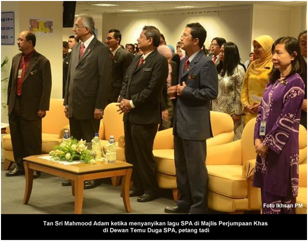 SPA 6 Jun ------ Pengerusi SPA, YBhg. Tan Sri Mahmood Adam mahukan supaya SPA mudah didekati dan berada dihati rakyat seperti yang diinginkan oleh pucuk pimpinan negara ini. Beliau berkata demikian dalam Majlis Perjumpaan Khas Bersama warga SPA yang diadakan di Dewan Temu Duga Putrajaya Aras 6, petang tadi. Beliau juga mahukan semua urusan bersama pelanggan dipermudah atau dipercepatkan, “Kita perlu berusaha untuk mempercepat dan memudahkan urusan dengan pelanggan seperti bersedia mengadakan urusan temu duga atau kursus pada waktu malam mengikut permintaan”. Ujarnya lagi, beliau meminta supaya SPA memberikan penjelasan kepada orang ramai tentang cara atau teknik untuk lulus dalam peperiksaan khas yang dianjurkan oleh SPA, dan memberi maklumat yang tepat mengapa seseorang calon tidak berjaya dalam peperiksaan atau pun temu duga. Turut hadir di majlis tersebut, Timbalan Pengerusi SPA, YBhg Dato’ Segarajah Ratnalingam, Setiausaha SPA, YBhg. Dato’ Lamien Sawiyo, Timbalan Setiausaha (Pengambilan), YBhg. Datuk Ramli Juhari, Timbalan Setiausaha (Perkhidmatan) Puan Lim Mooi Eia, pegawai-pegawai kanan dan warga SPA. Sejurus selepas majlis perjumpaan bersama Warga SPA, YBhg. Tan Sri Pengerusi mengadakan perjumpaan khas bersama media yang diadakan di Anjung Ilham. ------ MediaSPA