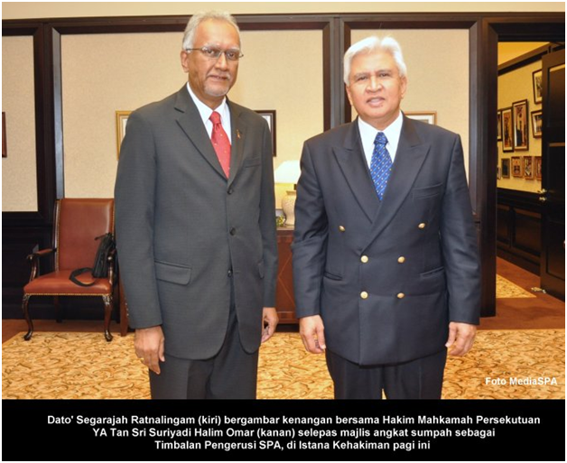 SPA 4 Jun ------ YBhg. Dato’ Segarajah Ratnalingam telah dilantik secara rasmi sebagai Timbalan Pengerusi Suruhanjaya Perkhidmatan Awam Malaysia berkuat kuasa hari ini. Upacara majlis mengangkat sumpah jawatan telah dilakukan dihadapan YA Tan Sri Suriyadi bin Halim Omar, Hakim Mahkamah Persekutuan. Hadir mengiringi upacara angkat sumpah tersebut, Setiausaha Bahagian Urus Setia Suruhanjaya Perkhidmatan Kehakiman Perundangan, Encik Anuar Othman dan Setiausaha Bahagian Urus Setia Mesyuarat, Encik Shafarin Nasuredin. ------ MediaSPA