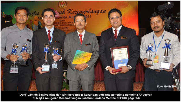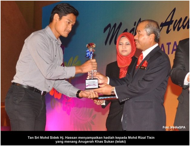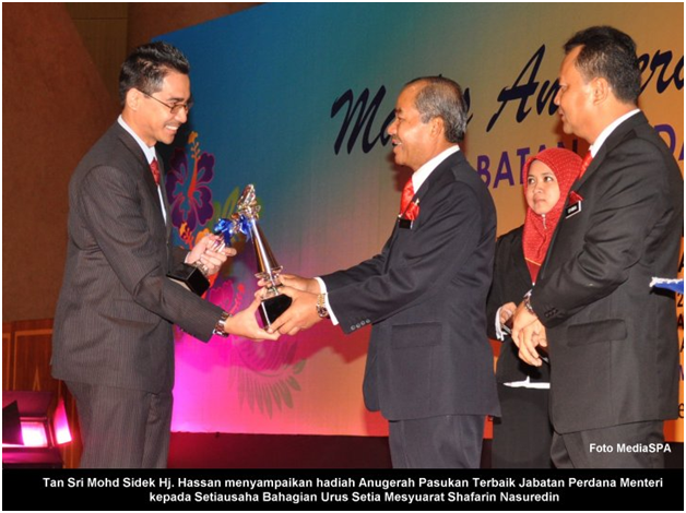 PUTRAJAYA, 8 Mei -----  Ketua Setiausaha Negara, YBhg. Tan Sri Mohd Sidek Hassan mengucapkan tahniah kepada Suruhanjaya Perkhidmatan Awam (SPA) di atas kejayaan merangkul 3 Anugerah Pencapaian Sukan Jabatan Perdana Menteri 2011 di dalam satu majlis yang berlangsung di Pusat Konvensyen Antarabangsa Putrajaya pagi tadi. Suruhanjaya Perkhidmatan Awam telah memenangi Anugerah Olahragawan JPM yang disandang oleh Joharry Othman dari Bahagian Peperiksaan menewaskan calon dari Jabatan Insolvensi Malaysia dan Jabatan Perangkaan Malaysia. Anugerah kedua dimenangi oleh Mohd Rizal Tisin yang memenangi Anugerah Khas Sukan menewaskan calon dari Unit Perancang Ekonomi. Anugerah ketiga yang dimenangi SPA adalah Anugerah Pasukan Terbaik Jabatan Perdana Menteri yang dimenangi oleh Pasukan Bolasepak SPA FC menewaskan pasukan Dragon Boat dari JPM. YBhg. Tan Sri Mohd Sidek Hassan telah menyampaikan hadiah-hadiah berupa wang tunai, sijil dan piala. Setiausaha SPA, YBhg. Dato’ Lamien Sawiyo dan Setiausaha Bahagian Urus Setia Mesyuarat, Encik Shafarin Nasuredin telah hadir di dalam majlis penyampaian anugerah tersebut. Terdahulu dari itu, Ketua Setiausaha Negara telah menyampaikan sijil kepada penerima Anugerah Perkhidmatan Cemerlang 2011. ----- MediaSPA