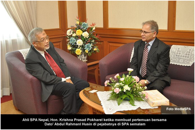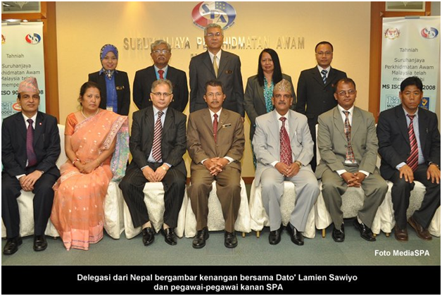 SPA, 8 Mei----- Suruhanjaya Perkhidmatan Awam Malaysia (SPA) hari ini telah menerima lawatan rasmi daripada Suruhanjaya Perkhidmatan Awam Nepal. Delegasi seramai 6 orang daripada Suruhanjaya Perkhidmatan Awam negara tersebut telah diketuai oleh Ahli SPA Nepal, Hon. Krishna Prasad Pokharel. Ketibaan rombongan telah disambut Setiausaha SPA, YBhg. Dato’ Lamien Sawiyo serta pegawai kanan SPA. Sejurus tamat sesi taklimat yang berlangsung di bilik Mesyuarat Suruhanjaya aras 10, delegasi telah dibawa melawat dewan temu duga di aras 6 dengan diiringi oleh YBhg. Dato’ Lamien Sawiyo. Terdahulu dari itu, Hon. Krishna Prasad Pokharel telah mengadakan kunjungan hormat kepada YBhg. Dato’ Abdul Rahman Husin, Ahli Suruhanjaya Perkhidmatan Awam Malaysia (Menunaikan fungsi Pengerusi SPA mengikut Perkara 142(3A) Perlembagaan Persekutuan). -----MediaSPA
