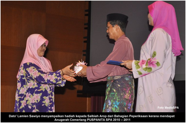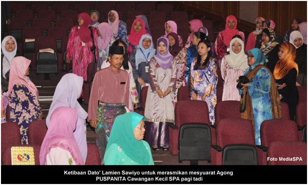 SPA, 11 Mei----- Setiausaha SPA, YBhg. Dato’ Lamien Sawiyo hari ini telah merasmikan Mesyuarat Agong PUSPANITA 2012–2014 Cawangan Kecil SPA, di Auditorium JPA. Hadir sama pengerusi PUSPANITA Cawangan Kecil SPA YBhg. Datin Normah Ibrahim, Timbalan Pengerusi Puan Lim Mooi Eia dan Ahli-Ahli PUSPANITA SPA. PUSPANITA Cawangan Kecil SPA turut memberi penghargaan kepada Puan Salbiah Arop sebagai penerima Anugerah Cemerlang PUSPANITA SPA 2010 – 2011. YBhg. Dato’ Lamien Sawiyo telah menyampaikan hadiah dan sijil kepada beliau sebagai tanda penghargaan. -----MediaSPA