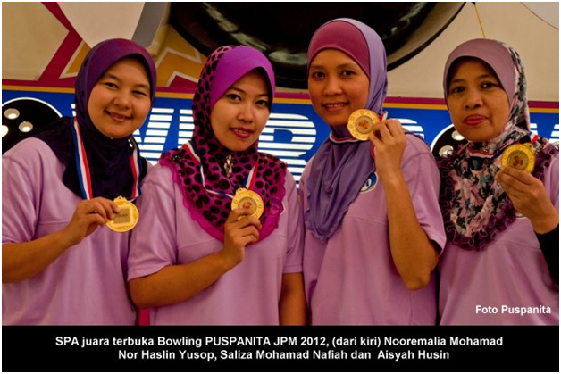 PUTRAJAYA, 2 April -----  Suruhanjaya Perkhidmatan Awam Malaysia (SPA) telah menjadi Johan Pertandingan Bowling PUSPANITA JPM 2012, yang berlangsung di ARL Power Bowl Alamanda Jumaat lepas. Dengan jatuhan pin sebanyak 1,745, pasukan SPA yang terdiri daripada gandingan Aisyah Husin, Nor Haslin Yusop, Saliza Mohamad Nafiah dan Nooremalia Mohamad telah menewaskan pasukan dari SPRM yang mendapat Naib Johan. Sebanyak 22 pasukan telah menyertai pertandingan pada tahun ini. Sementara itu, Nor Haslin Yusof dari SPA telah mendapat tempat ke dua dalam kategori High Score dengan 477 jatuhan pin. Hadiah telah disampaikan oleh YBhg. Datin Noor Zaidah Umar, Timbalan Pengerusi PUSPANITA JPM. ----- MediaSPA