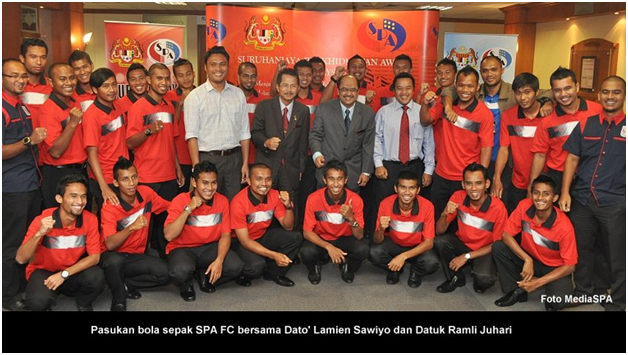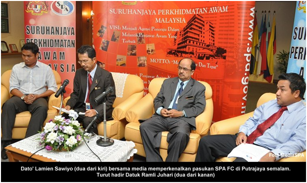 PUTRAJAYA, 21 Mac------ Setiausaha SPA merangkap Presiden SPA FC, YBhg. Dato’ Lamien Sawiyo hari ini telah mengadakan Sidang Media untuk memperkenalkan pasukan SPA FC sempena perlawanan suku akhir di antara SPA FC dan Kelantan sabtu ini. Turut hadir Timbalan Presiden SPA FC, YBhg. Datuk Ramli Juhari, Setiausaha SPA FC, Aidid Molana dan Jurulatih SPA FC, Nidzam Jamil. "SPA FC sebuah pasukan bola sepak dari jabatan kerajaan, yang disertai oleh warga SPA, tiada pemain import atau profesional’’. Pasukan SPA FC telah layak menyertai Piala FA pada tahun 2011 dan pada tahun ini, SPA FC telah layak hingga ke peringkat suku akhir. ‘’Ini adalah satu rekod, iaitu pasukan pertama dari Liga FAM yang akan bertanding ke peringkat suku akhir’’ katanya." Beliau juga berkata, dari segi prestasi dalam tahun ini, SPA FC telah memenangi kesemua perlawanan dalam Liga FAM. Dengan kemenangan tersebut, SPA FC kini menjadi pendahulu dalam Liga FAM. SPA FC juga telah memenangi dua perlawanan dalam piala FA iaitu menentang MBJB dari liga Perdana dan pasukan Preah Khan Reach dari Kemboja. Dengan kemenangan itu diharapkan dapat memberi semangat dan motivasi yang tinggi kepada pemain-pemain untuk mencapai kejayaan yang seterusnya. Beliau juga mengharapkan pemain-pemain dapat mempamerkan perlawanan bersungguh-sungguh ketika bertemu dengan Kelantan pada Sabtu ini dalam saingan suku akhir Piala FA 2012. ------MediaSPA