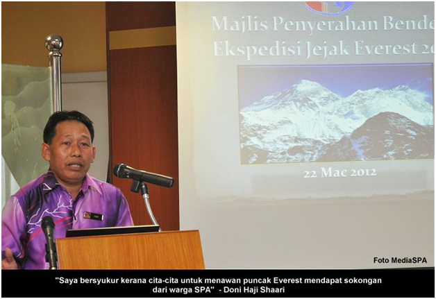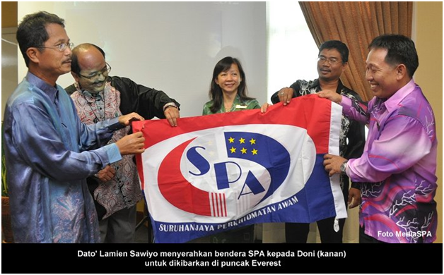 SPA, 23 Mac------ Suruhanjaya Perkhidmatan Awam Malaysia (SPA) telah mengadakan Majlis Penyerahan Bendera Ekspedisi Jejak Everest 2012. Penyerahan bendera SPA yang akan dibawa ke puncak Gunung Everest telah disempurnakan oleh YBhg. Dato’ Lamien Sawiyo kepada Encik Doni Haji Sahari. Beliau yang bertugas di Urus Setia SPA Cawangan Sarawak, akan berlepas ke Katmandu pada hari ini, 23 Mac 2012. Menurut YBhg. Dato’ Lamien Sawiyo, majlis yang diadakan ini adalah merupakan penghormatan kepada beliau dan merupakan satu usaha yang murni. ”Sama-samalah kita mendoakan agar beliau dapat mencapai cita-cita untuk menjejaki puncak Everest, dan seterusnya dapat mengibarkan bendera SPA di puncak Gunung Everest” . Hadir sama, Timbalan Setiausaha (Pengambilan) YBhg. Datuk Ramli Juhari, Timbalan Setiausaha SPA (Perkhidmatan) Puan Lim Mooi Eia. Menurut YBhg. Dato’ Lamien lagi SPA sentiasa mengalu-alukan kepada seluruh warga SPA supaya aktif dalam pelbagai bidang sukan seperti Bola Sepak, Bola Jaring, Bowling, Badminton dan lain-lain yang boleh mengharumkan nama SPA. ”SPA sudah terkenal di JPM kerana kita yang unggul (aktiviti sukan) dan kita harap ia tidak dirampas oleh pihak lain”. Diakhir ucapan, ”Ini merupakan satu suntikan semangat kepada Encik Doni, dapat mencapai cita-cita beliau untuk menjejaki Gunung Everest, dan harapan SPA semoga beliau berjaya.” ------MediaSPA